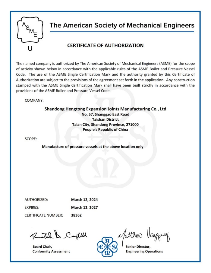 公司取得我國特種設備制造許可證、壓力容器A1級資質、壓力管道元件A、B的資質,并且獲得了歐盟PED-CE認證、美國ASME“U”鋼印、ISO 9000質量管理體系認證、GB/T 14000 環(huán)境管理體系認證及GB/T 45000 職業健康安全體系認證。膨脹節(jié)產品涵蓋壓力管道波紋膨脹節(jié)、壓力容器波形膨脹節(jié)、金屬波紋管、金屬軟管、聚四氟補償器、橡膠補償器及非金屬補償器等。